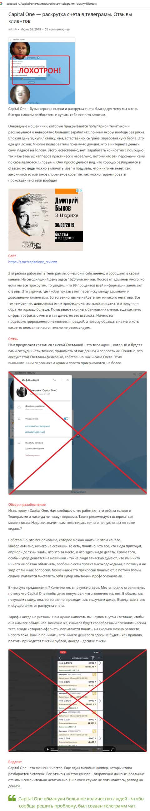 По той информации, которая осталась в интернете, можно точно узнать, чем занималась кухня Капитал Ван. Жулики CapitalOne был одним из липовых капперов, который предлагал якобы инсайдерскую информацию для ставок на спорт. Главным инструментом в их деятельности был Телеграм-канал, где и проводился развод.