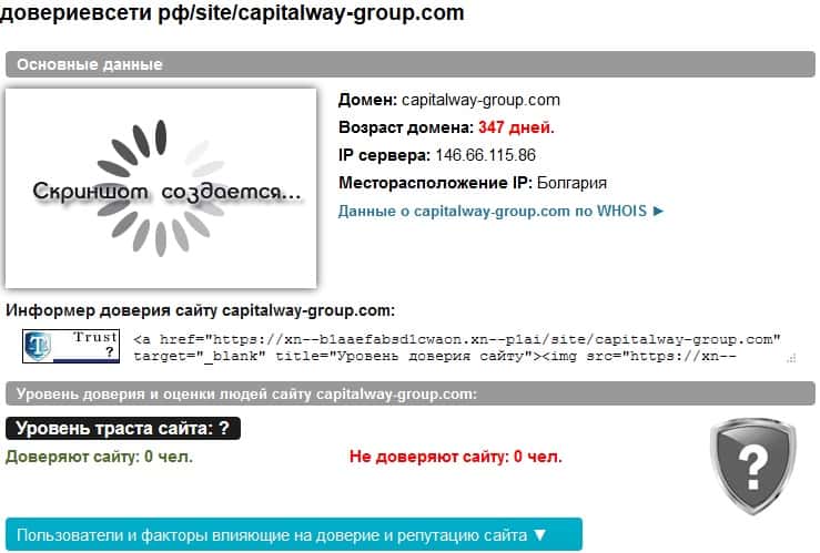 Известный авторитетный источники довериевсети ком не выдает вообще никаких оценок работе Capital Way Group. Это уже плохой знак, потому что обычно хоть несколько человек, а ставят свои оценки. Если их тут нет, то не стоит связываться с данной конторой. Возьмите себе это на вооружение и используйте в будущем.