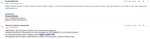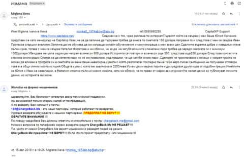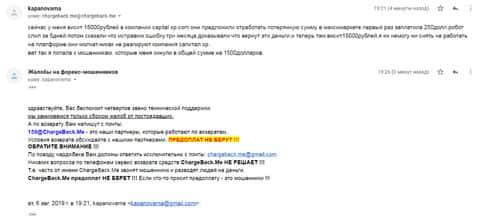 В следующей жалобе рассказывается, как мошенники Капитал ХП смогли украсть у человека порядка 1500 долларов. Жулики начинали с небольших сумм, которые робот сливал в считанные дни, а потом стали вымогать больше денег. У жертвы лопнуло терпение и она написала всю правду в организацию ChargeBack.Me