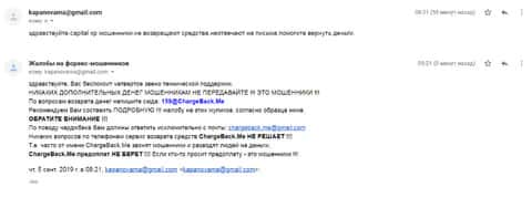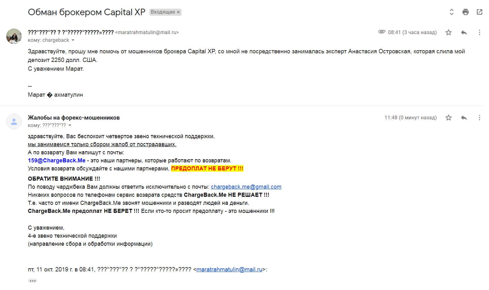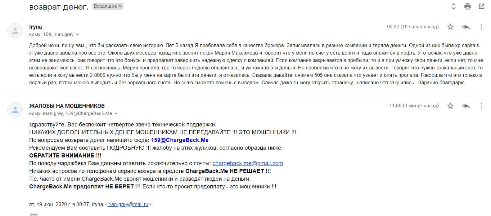 Женщина обратилась в организацию ChargeBack.Me дабы те помогли вернуть ей деньги из мошеннической конторы Capital XP. Аферисты вытащили 10 000 рублей и пообещали, что она сможет вывести деньги в любой момент. Но на деле получилось так, что просят вложить еще 15 000 рублей, чтобы вывести уже вложенные.