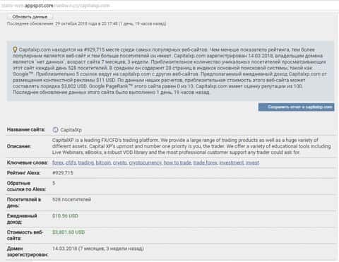 Согласно данным популярного скринера сайтов statis-web appspot com официальный сайт брокерской конторы Капитал ХП на 29.10.2018 находится на 929 715 месте. Мошенники заригистрировали свой домен в марте этого года и имеют очень маленький рейтинг просмотров сайта. Ежедневный доход с сайта кухня получает 11 долларов, а сам сайт оценивается в 3800 долларов. И напоследок их сайт имеет оценку 0 согласно Google PageRank. Таким образом можно сделать вывод о том, что компания Capital XP врет о своих крутых оборотах и вообще оо своей деятельности. Такой общий рейтинг присущ только мелким мошенникам и аферистам, которые только и делают, что обманывают людей.