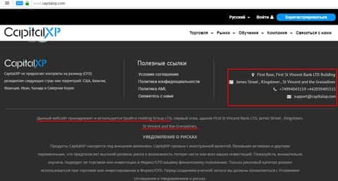 На официальном сайте компании Capital XP, размещена информация о том, что брокер-аферист принадлежит компании Quattro Holding Group LTD, которая находится на Гренадинах. И снова аферисты накрутили схему и главный офис поставили в офшоре. Естественно эта информация указывает на то, что компании мошенники и главная их задача обнести своего клиента.