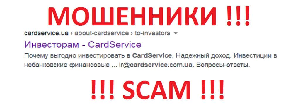 Менеджеры CardService Ua разводят наивных граждан своими красивыми речами, но когда дело касается выплат и финансовой стороны вопроса сразу возникают неприятные проблемы! Чаще всего жулики не выполняют условия договора, нарушают сроки и со скандалами выплачивают вкладчикам процентные ставки! Разводилы красиво рассказывают, но не больше!