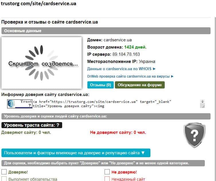 Для того чтобы убедиться в степени доверия пользователей к любой организации, можно выполнить проверку на Доверие в сети. После выполнения такой процедуры с шарагой Кард Сервис оказалось, что уровень доверия среди юзеров нулевой! И это за такой длительный период работы, не нашлось ни одного благодарного клиента, который оценил бы Кард Сервис!