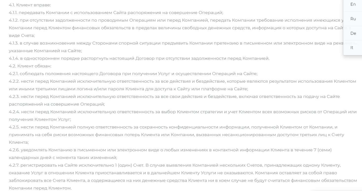 Пункт 4.1 клиентского соглашения конторы KatanaInvest рассказывает о том, что клиент несет ответственность перед компанией за все свои действия и даже бездействие.