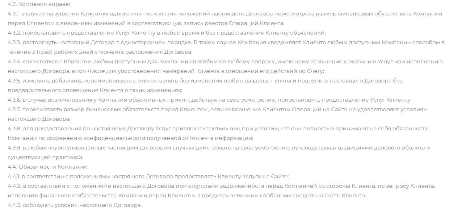 В пункте договора 4.3 с клиентом компания KatanaInvest говорит, что вправе приостановить действие договора или расторгнуть его в случае нарушений со стороны клиента.