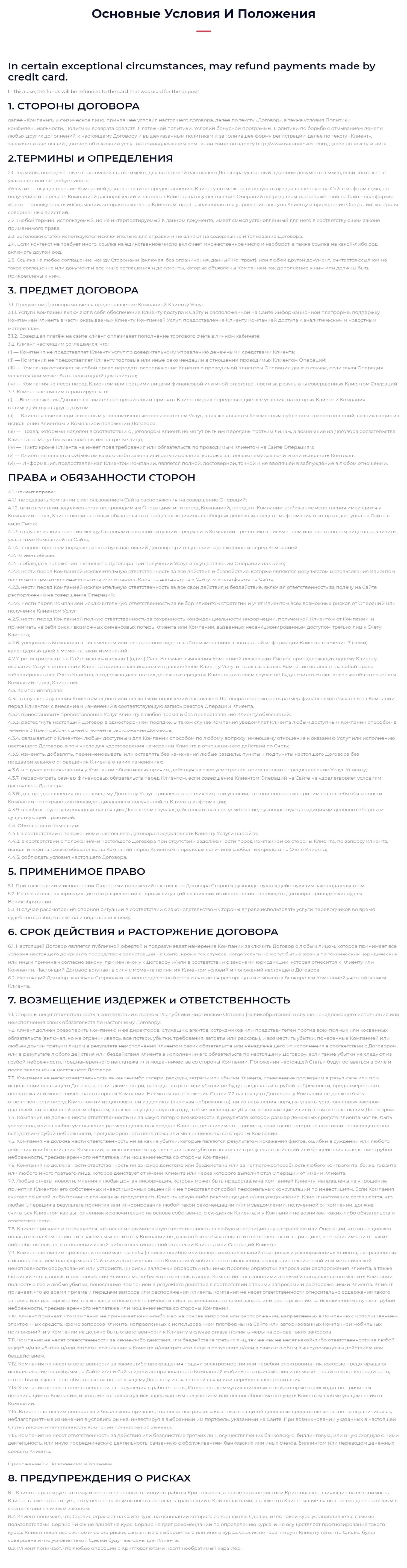 Раздел 8 предупреждает пользователя, что компания KatanaInvest ни в коем случае не несет ответственности за любые убытки клиента, с чем он должен быть согласен.