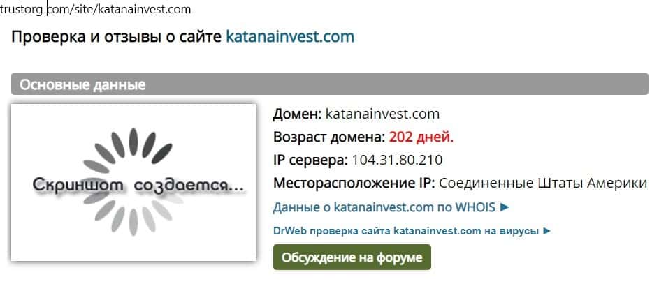 Возраст доменного имени сайта katanainvest com составляет 202 дня. Это очень маленький срок, поэтому брокер не может быть солидной компанией, о чем он пишет на сайте.