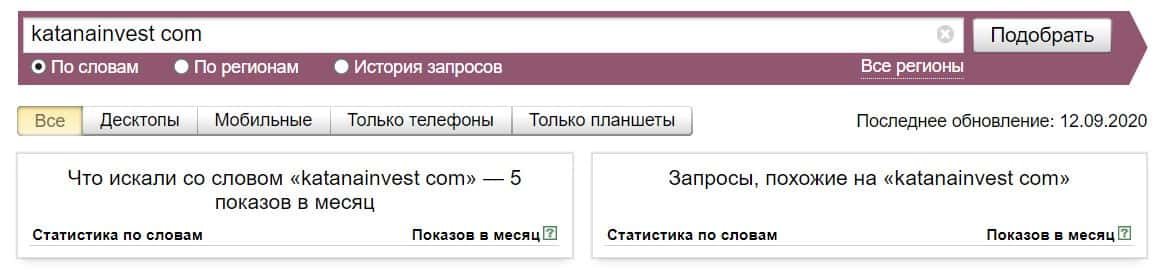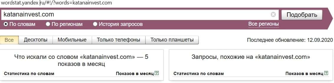 В поисковой системе Яндекс сайт брокерской конторы "katanainvest.com", вбитый в строку с точкой, пользователи искали всего лишь 5 раз за месяц.