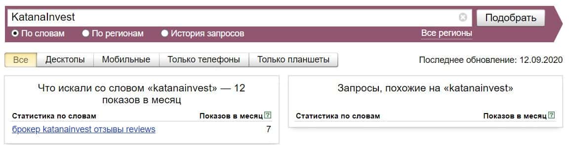 Название мошеннической конторы "KatanaInvest", написанное на английском языке, пользователи искали в системе Яндекс 12 раз за месяц.
