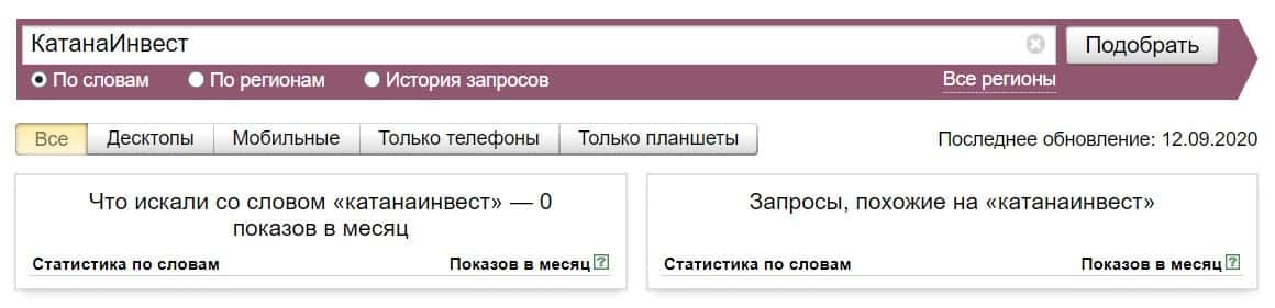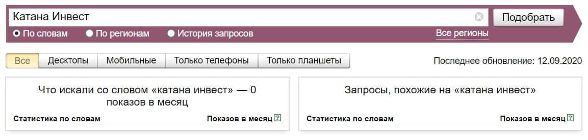 Название бренда на русском языке без пробела "КатанаИнвест", пользователи не искали в системе Яндекс ни разу.