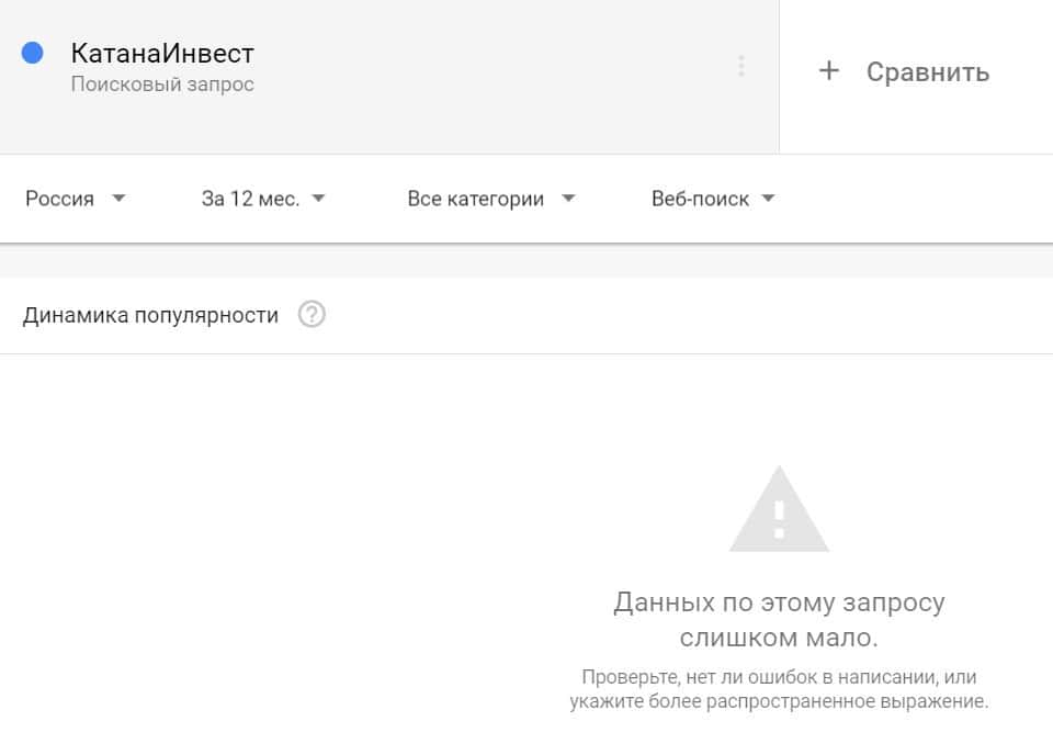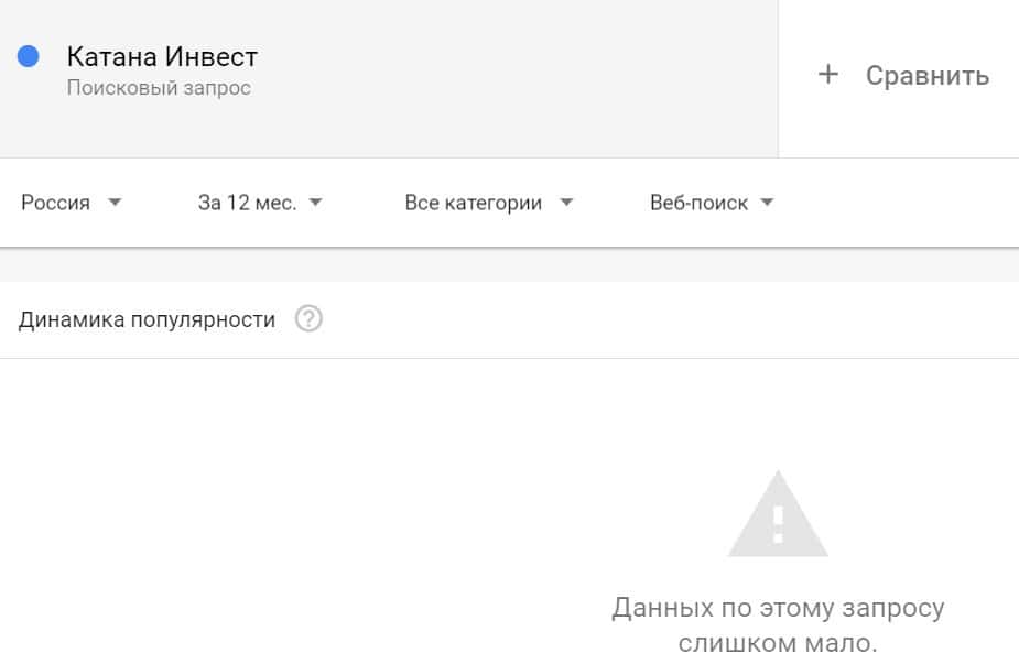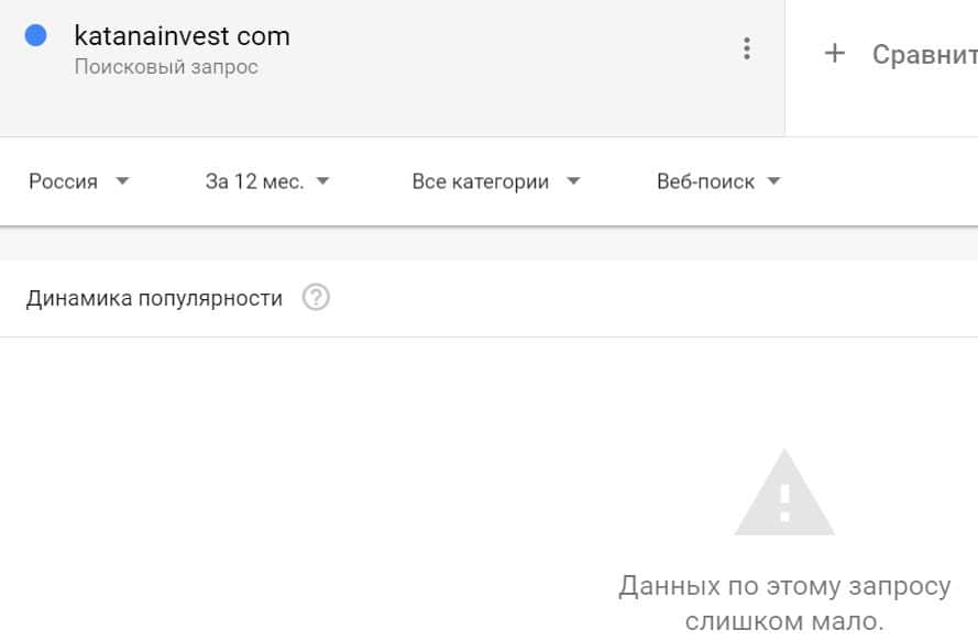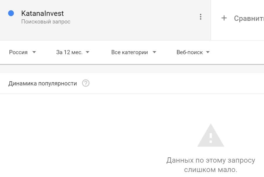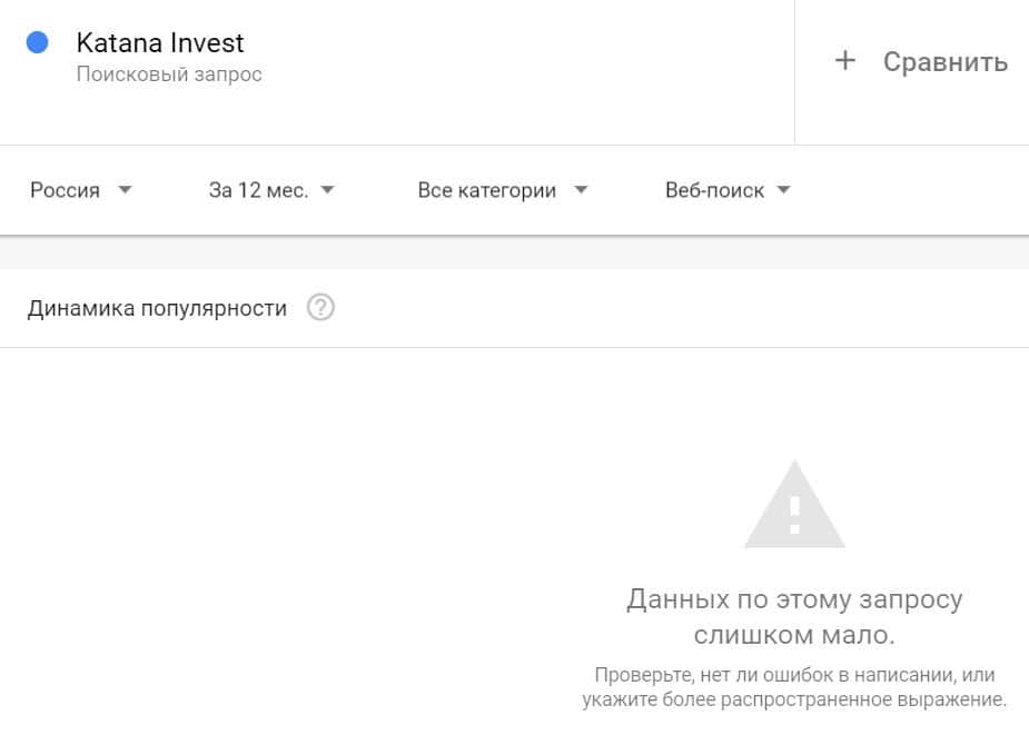 Посмотрим, насколько популярно название бренда "KatanaInvest", написанное на английском языке. Данных по этому запросу нет, так как в Гугл не было большого количества запросов.