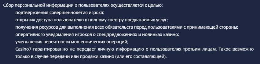 Далее на изображении ниже вы можете самостоятельно ознакомится с данным пользовательским соглашением, которое представили аферисты Casino7 и создали по своим стандартам.