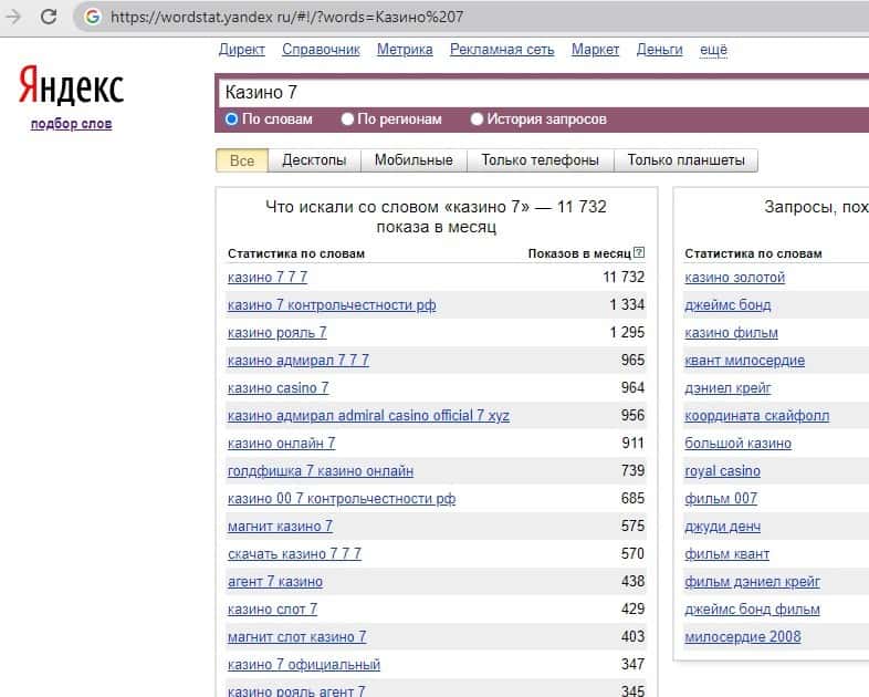 Судя по количеству запросов бренда "Casino7", аферисты не пользуются особым спросом у посетителей ресурса yandex ru и таких пользователей всего 2026 запросов из много миллионной аудитории.