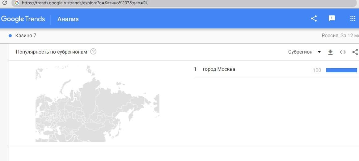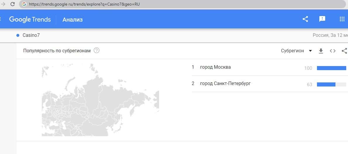 У бренда "Казино 7" немного больше запросов чем у выше представленного, но все равно для миллиардной аудитории всего 11732 запроса, это просто не о чём, доверия к ним нет.