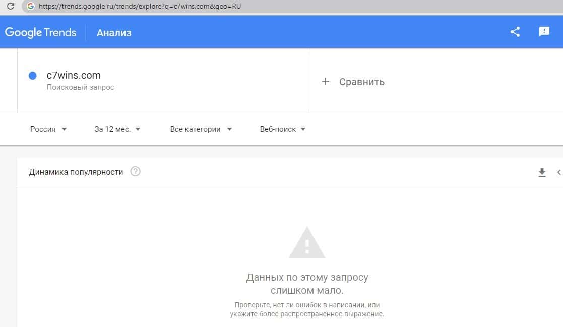 По запросу бренда "c7wins.com" вообще все печально и не имеет спроса ни у кого. Данный запрос не пользуется доверием и популярностью у посетителей портала google com.