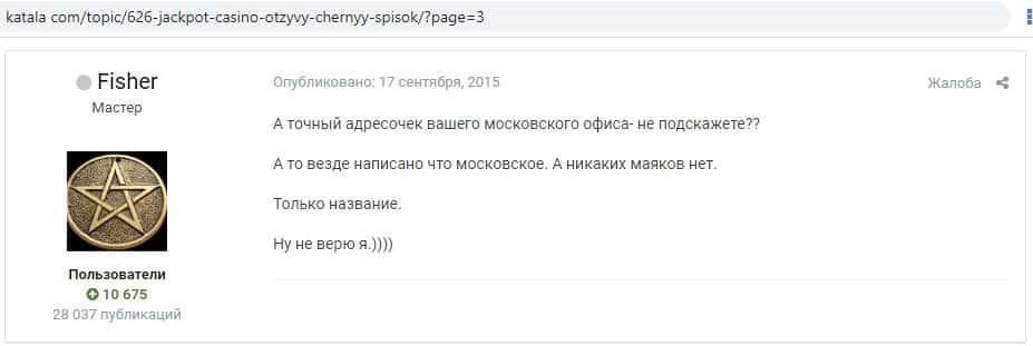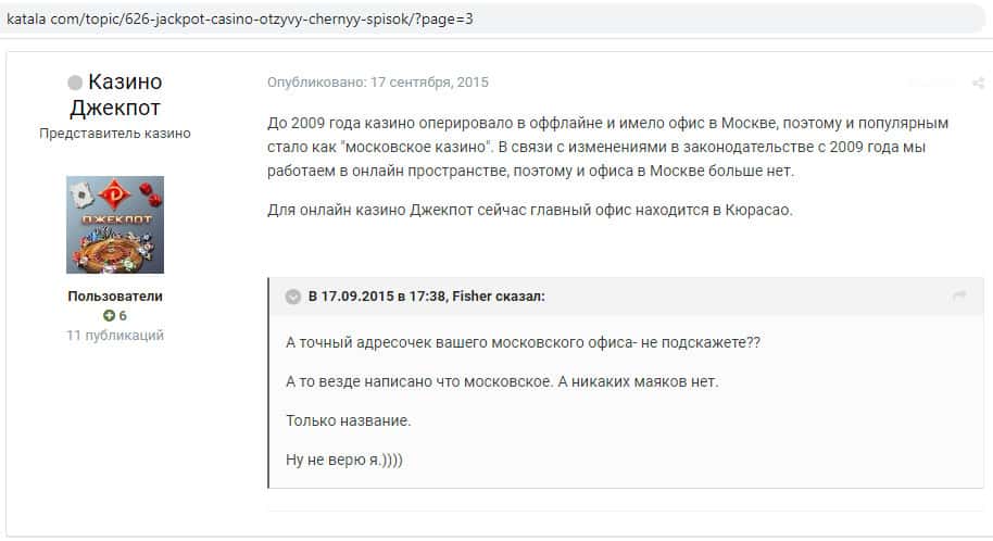 При всем этом, мошенники Казино Джекпот не называют реальный адрес своего казино, потому что не хотят, чтобы к ним кто-то наведался в гости.