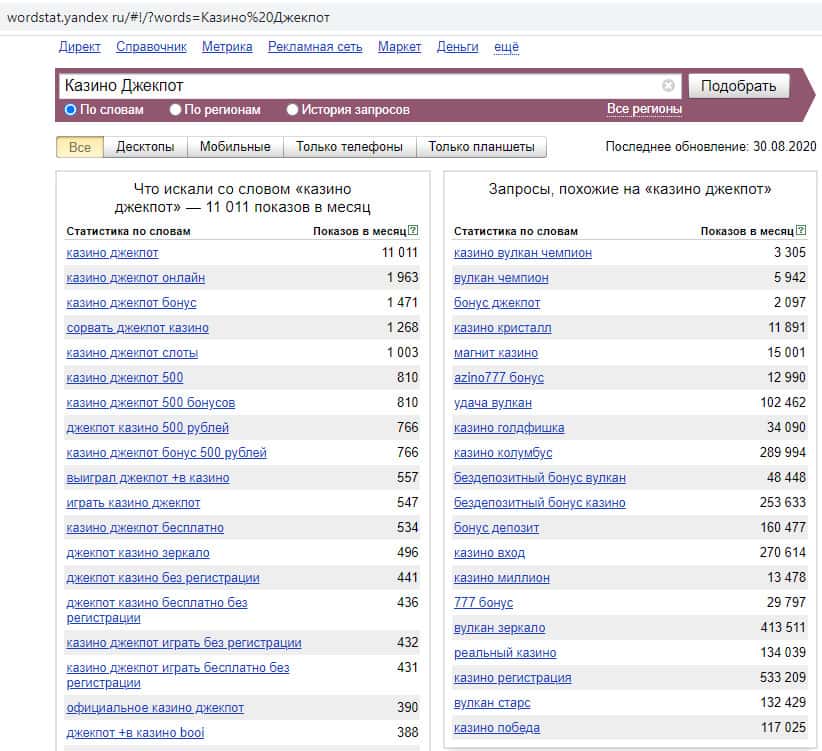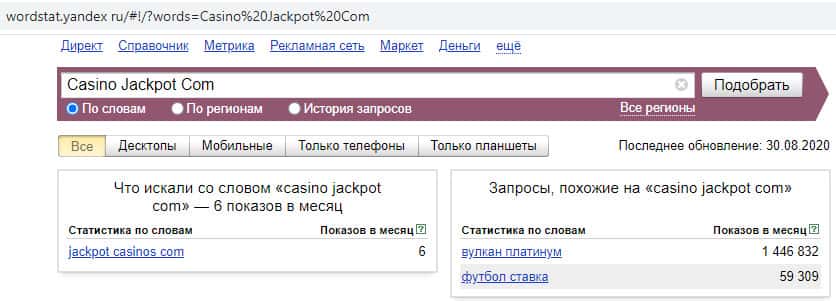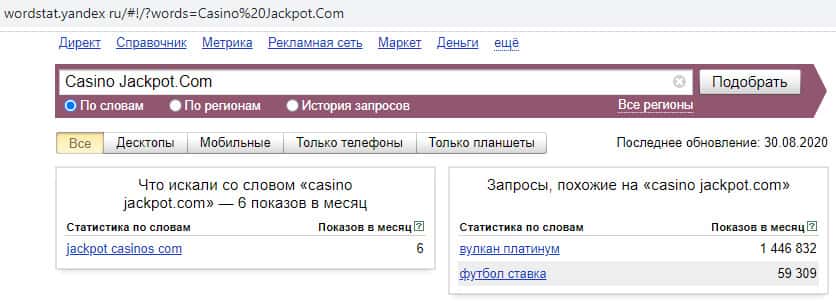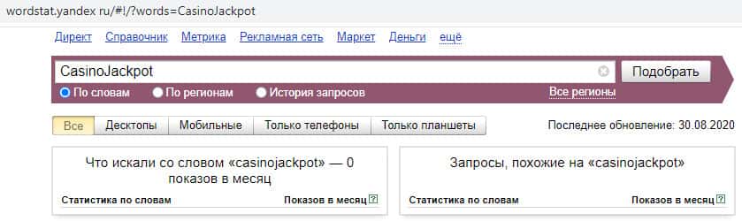 - Какое количество запросов по Казино Джекпот показывает Яндекс?