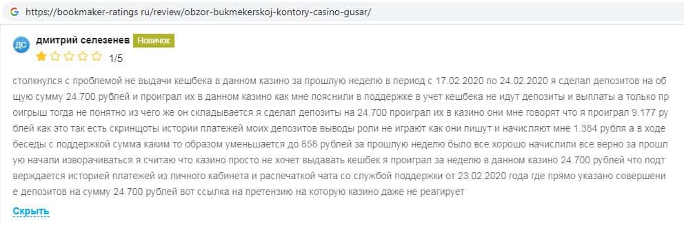 Отзывы о мошеннической организации Казино Гусар, ныне присутствующие в сети