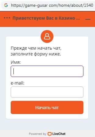 Мошенники Казино Гусар предоставили в качестве обратной связи онлайн-чат, при помощи которого ведут сбор данных о клиенте, фиксируя все данные на сайте.