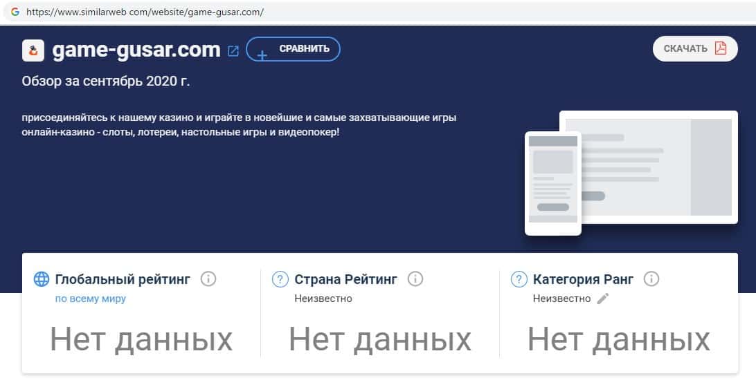 При проверке источников бренда по странам скам-компании Game Gusar на сайте similarweb com, информация отсутствует, что является признаком фейкового лохотрона.