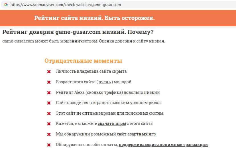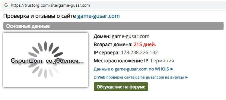 Проверка интернет-сервиса аферистов Game Gusar на trustorg com показала, что возраст домена к моменту написания статьи составляет 215 дней, скорее всего домен купленный.