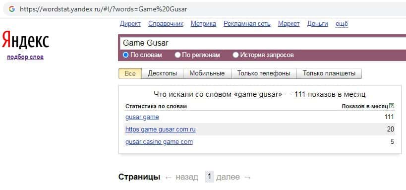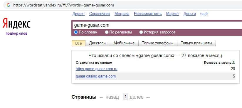 Количество брендовых запросов название домена компании "game-gusar.com" на Вордстарт Яндекс Ру составляет 27 запросов за месяц.