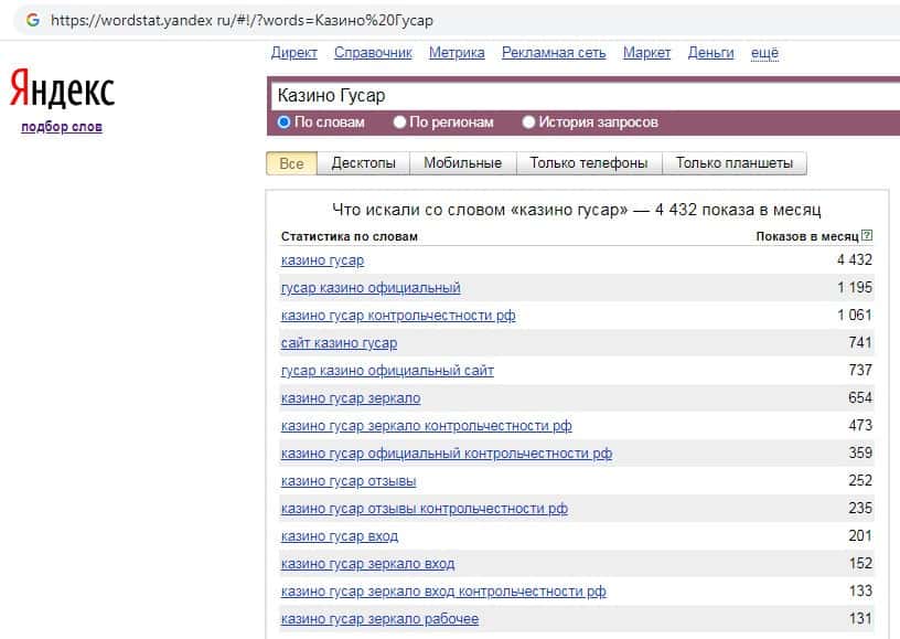 - Количество брендовых запросов Казино Гусар в поисковике Google