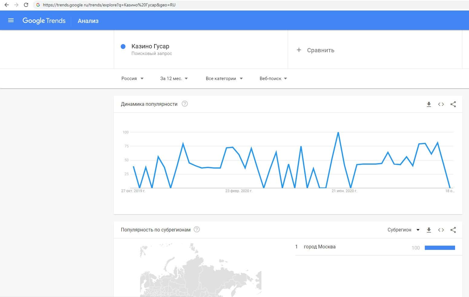 Динамика популярности брендовых запросов названия компании на русском языке с пробелом "Казино Гусар" на Трендс Гугл Ру отображена на графике ниже.