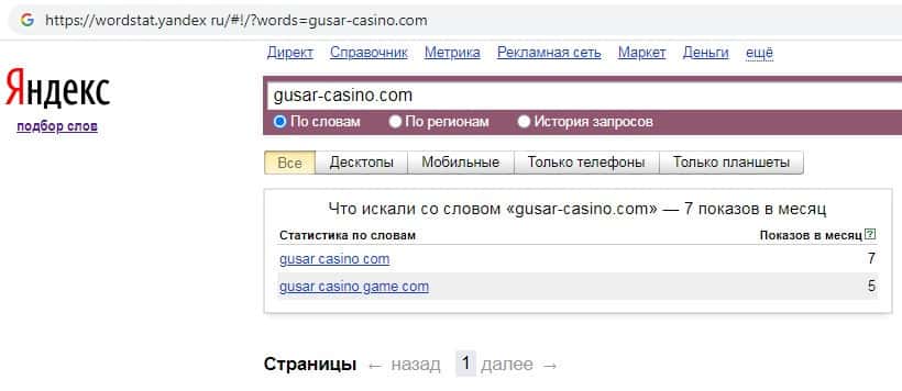 Количество запросов по бренду название домена компании "gusar-casino.com" на Яндекс Вордстарт составило 7 запросов за месяц.