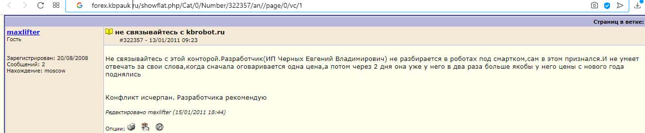 KBRobot - очередная шарашкина контора, которая предлагает купить торгового робота, чтобы воротить миллионами. Многие люди уже повелись на этот развод и не только не смогли вернуть деньги за липовую программу, но и слили свой депозит. Всем заправляет некий Евгений Черных, и все же мы не рекомендуем вестись на его развод.