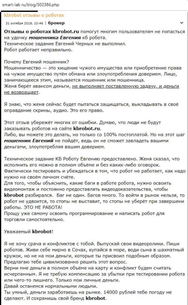 Далее представлен развернутый отзыв-обращение к руководству конторы KBRobot, в котором описана подробная ситуация, как человек заплатил деньги этому лохотрону, но аферисты не сделали свою работу так как нужно. Речь идет о сумме в 14 000 рублей и похоже, что жулье не собирается возвращать деньги.