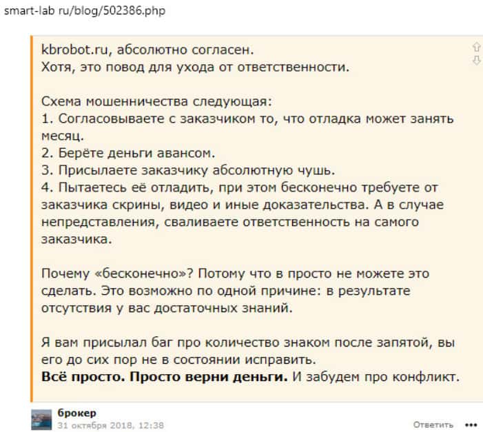 Еще один отзыв касательно того, что аферисты KBRobot не будут нести ответственность перед клиентом, у которого взяли деньги на разработку робота. Аферисты используют кучу отмазок и определенную схему развода. В данном отзыве клиент просто просит вернуть украденные средства обратно.