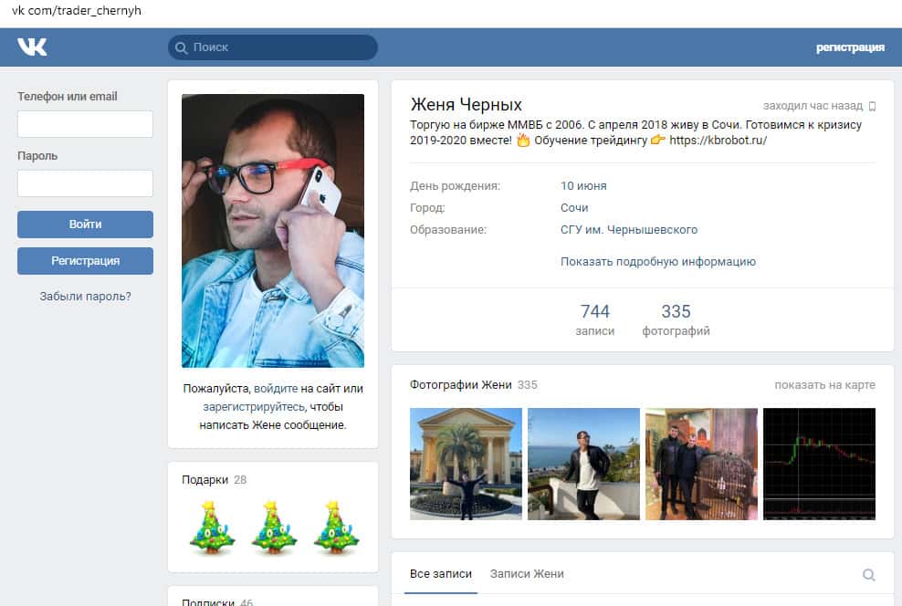 Шулерская контора KBRobot ведет свою деятельность в социальных сетях для того, чтобы как можно больше лохов привлечь в свой проект. Далее представлен скриншот странички в ВКонтакте, только ссылка идет на самого разработчика Женю Черных. Если он будет вам писать, то немедленно блокируйте разговор. Ссылка на аккаунт vk com/trader_chernyh