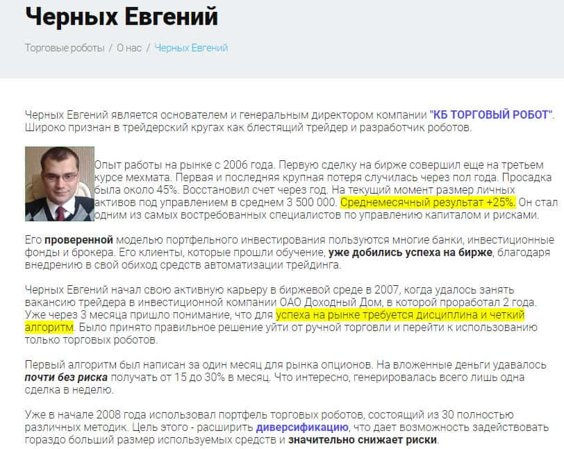 Форекс-контора KBRobot, которая выпускает роботов для торговли, не скрывает лицо своего владельца и основателя и его зовут Черных Евгений. Он распиаренный в трейдерских кругах и соответственно некоторые ведутся на его мошеннические разработки. Если он зарабатывает такие проценты торгуя на финансовых рынках, то зачем продавать эти знания? Ответ очевиден.