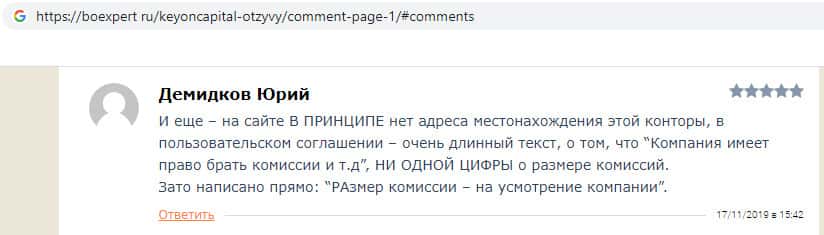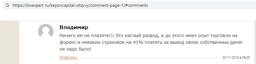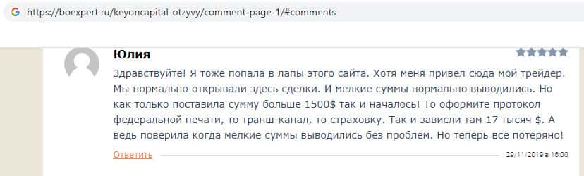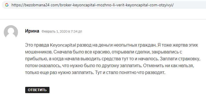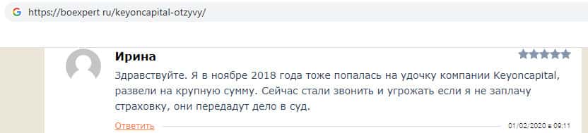 В своём отзыве о компании кидал KeyONCapital пользователь сообщил, что в ноябре 2018 года попался на удочку мошенников и инвестировал крупную сумму денег, которую компания успешно присвоила, после чего мошенники начали звонить пользователю и требовать оплатить вымышленную страховку, иначе они передадут дело в суд.