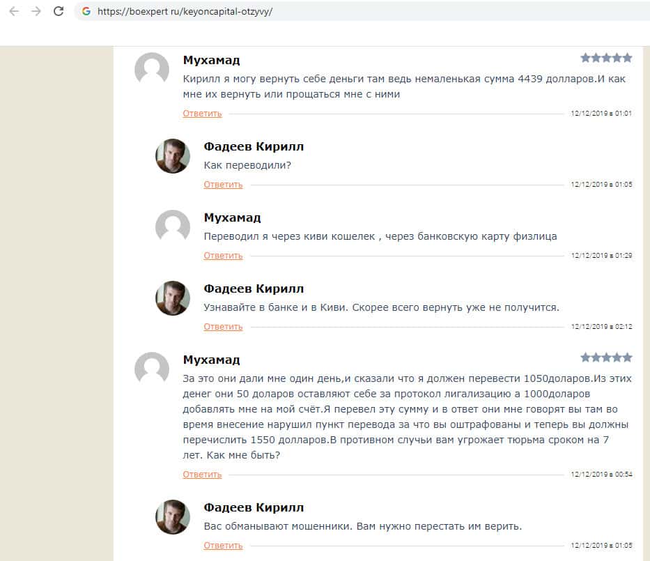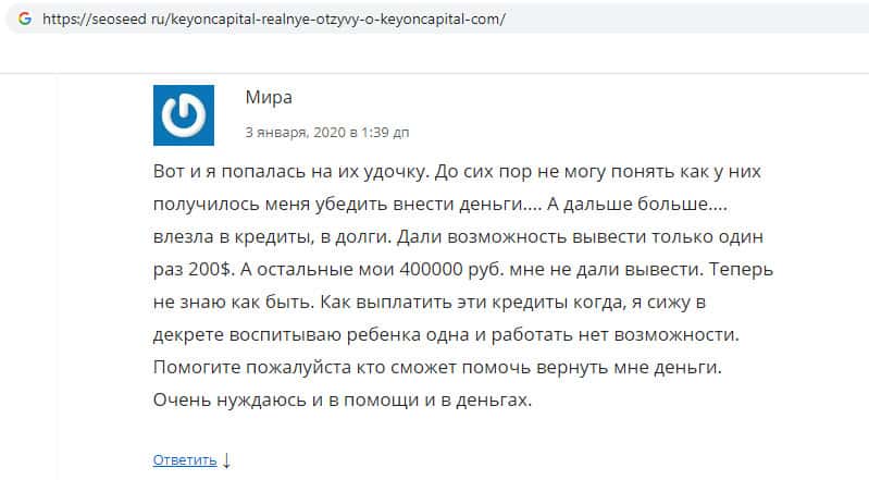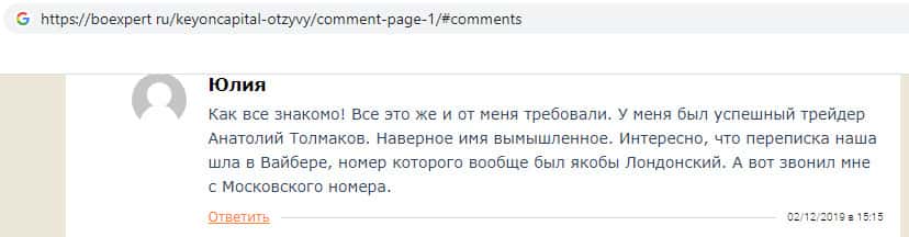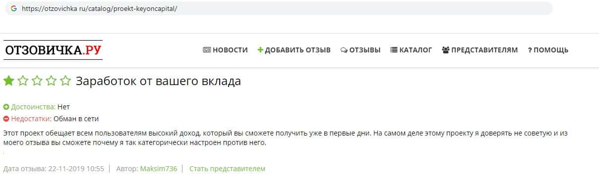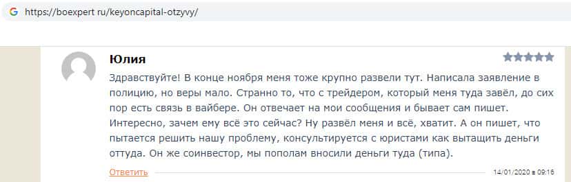 В своём отзыве о мошенниках KeyONCapital пользователь обвинил компания в обмане пользователей в сети, так как компания обещает клиентам быстрый и большой заработок, который пользователь сможет вывести в первые же дни, но на самом деле это лохотрон, который просто разводит людей, заставляя их вкладывать деньги в надежде заработать.