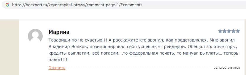 Пользователь сообщил, что с ним связался успешный трейдер по имени Владимир Волков, который зарабатывает в компании KeyONCapital. Он наобещал золотые горы пользователю, погашение кредитов и прочее богатство, после чего пользователь поддался, а затем предъявили клиенту налоги, о которых изначально никто ничего не говорил.
