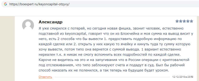 В отзыве о недоконторе KeyONCapital пользователь сообщил, что уже смерился с потерей денег, но вдруг ему позвонил человек, и сказал что он из блокчейна, и заявка на вывод его средств весит у него. Это был конечно же подставной человек из KeyONCapital. Он предложил пользователю внести сумму равную сумме его вывода, что бы забрать деньги, но это очередной развод.