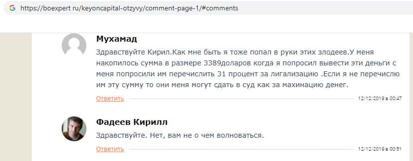 В данном отзыве мы видим, что пользователь сообщил, что он попал в руки злодеев KeyONCapital. Он сотрудничал с компанией и на его счету накопилась сумма в размере 3389 долларов, после чего он решил её вывести, но компания потребовала 31 процент на легализацию, и если пользователь откажет, то на него компания якобы подаст в суд за махинацию денег.
