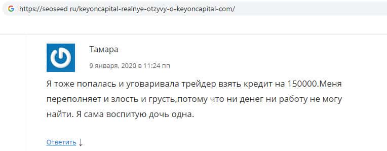 Пользователь Тамара сообщила, что попала в лохотрон KeyONCapital, где некий трейдер заставил взять её кредит на сумму 150000 рублей. Теперь пользователь остался без денег, не может найти работу и не на что кормить детей. Жуликов не заботит судьба пользователей, их главная цель это нажива, и никого они не будут жалеть.