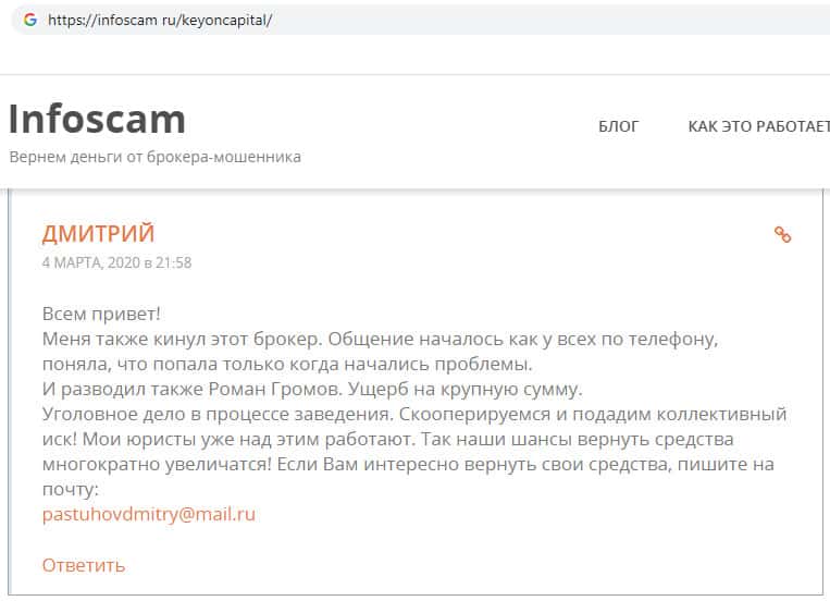 Пользователь узнал о мошенничестве компании KeyONCapital после того как его развели на деньги