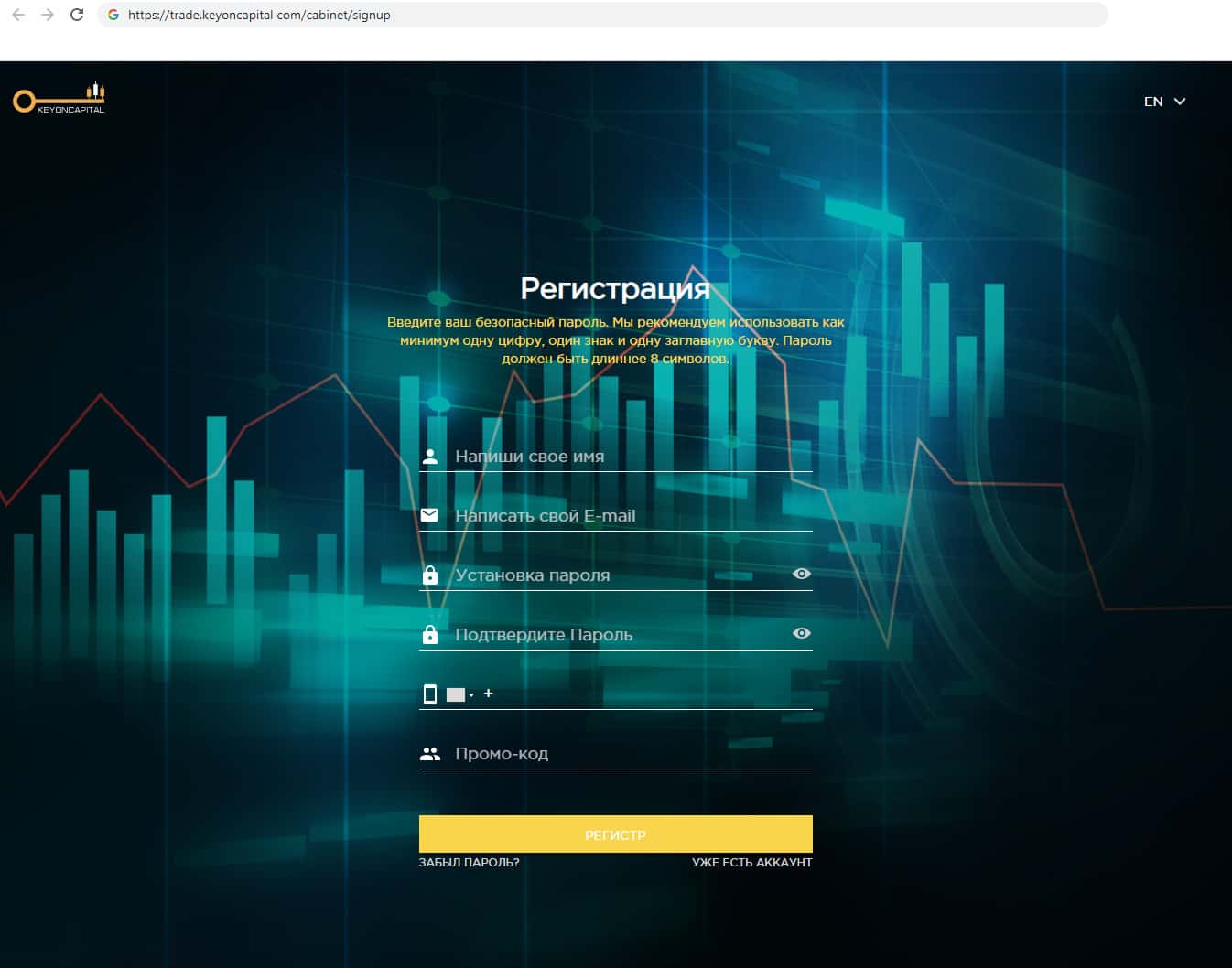 Мы зарегистрировались в компании кидал KeyONCapital что бы продемонстрировать вам вид платформы кидал. Вся платформа это просто картинка для пользователей, так как к настоящему трейдингу она никакого отношения не имеет. Жулики сделали правдоподобный проект, что бы пользователи решили что действительно могут заработать.