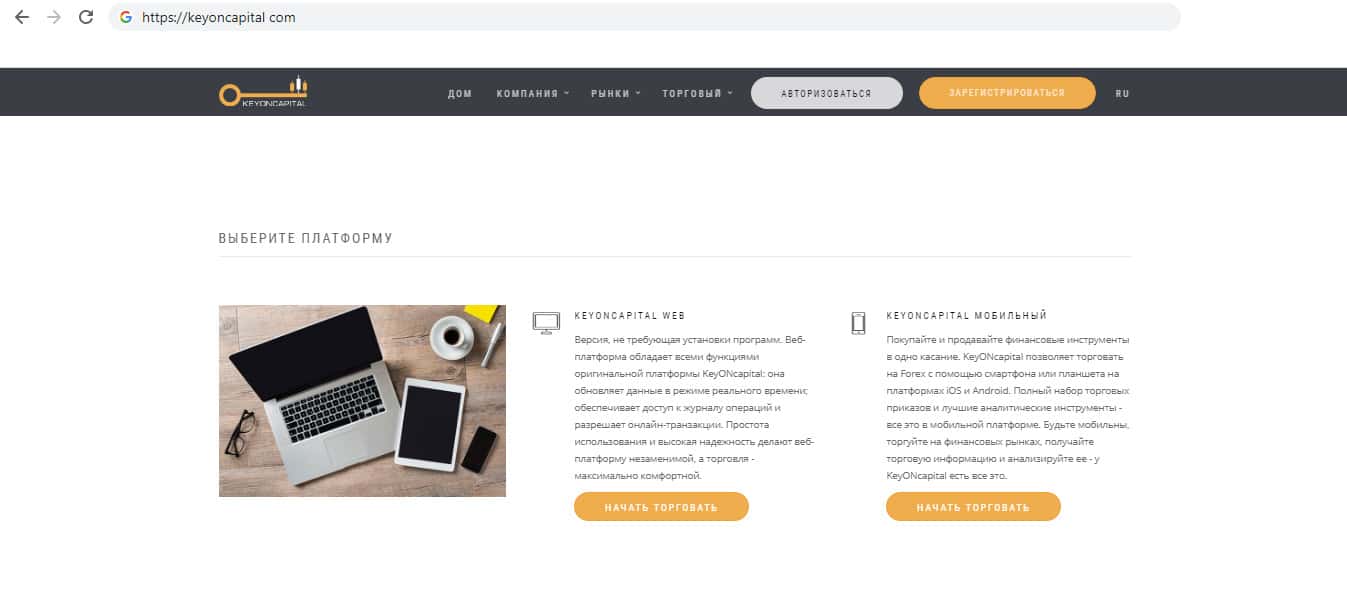 Лохотронщики KeyONCapital представили пользователям выбор платформы. Жулики предоставили на выбор платформу для ПК и платформу для мобильного устройства, что бы пользователи якобы могли торговать с любой точки мира. Всё это сделано для того, что бы привлечь больше пользователей, которые подумают, что это действительно удобно и можно попробовать торговлю.