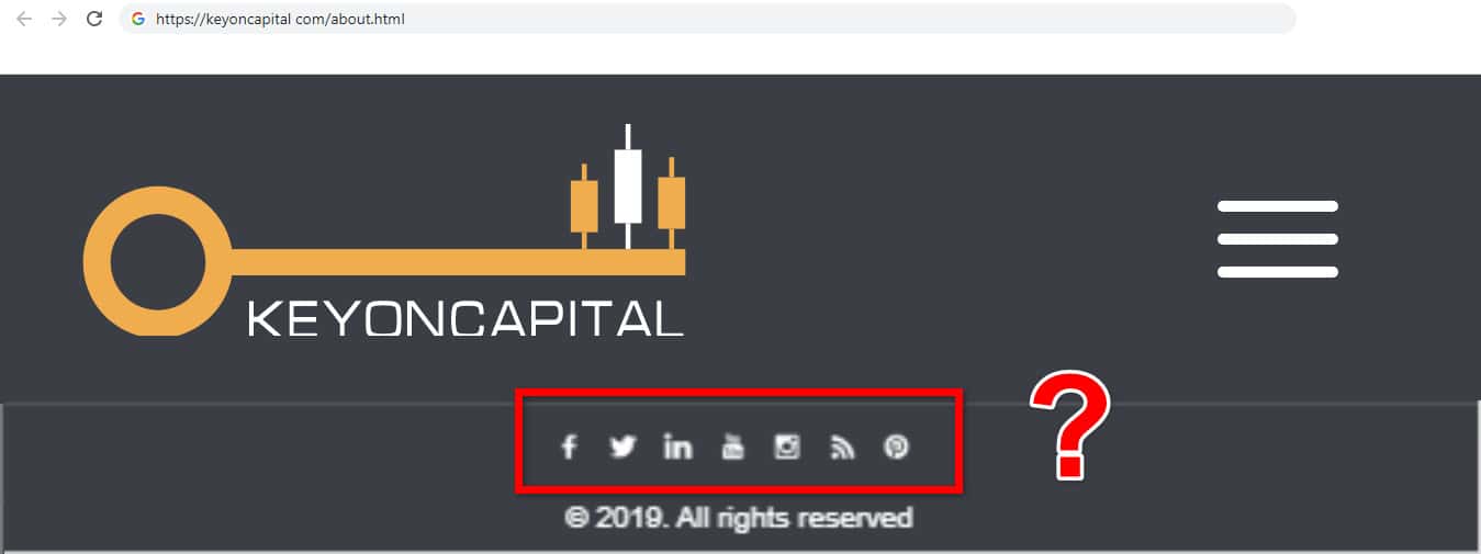 Фирма махинаторов KeyONCapital указала на сайте информацию о том, что компания сотрудничает с множеством социальных сетей. Интернет ресурсы так же говорят о том, что фирма рекламирует себя социальных сетях. но на сегодняшний день компания удалила все аккаунты, так как даже активные ссылки на сайте не работают, а это просто картинка.