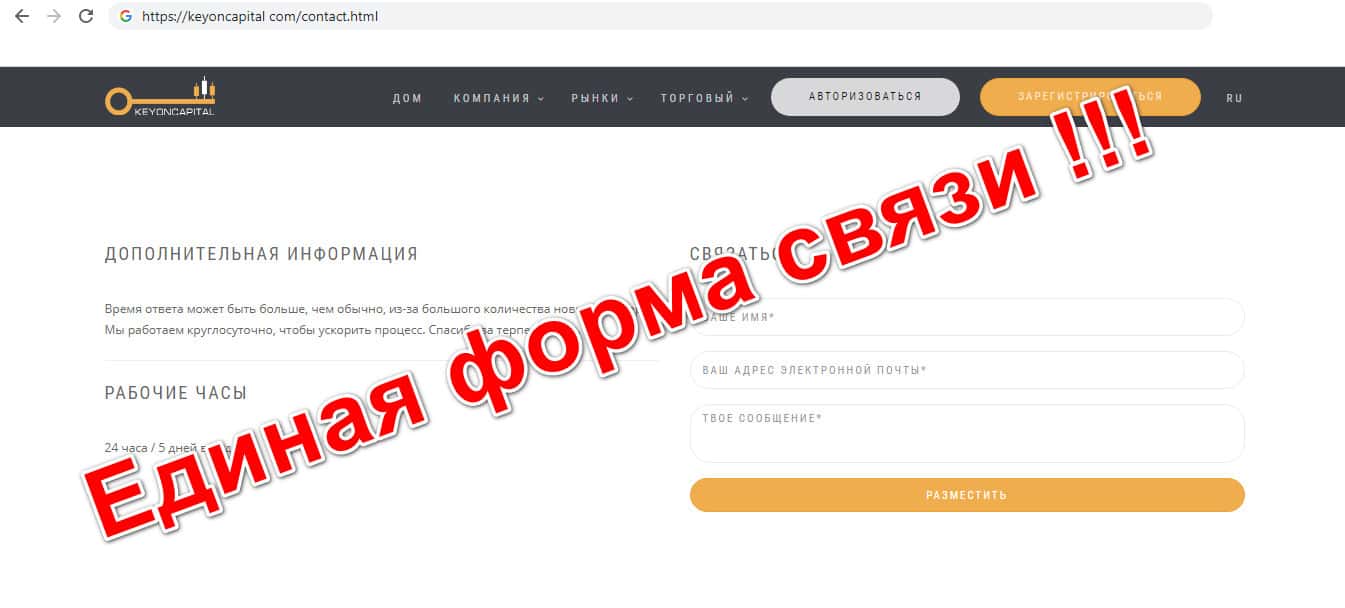Недоконтора Кей ОН Капитал не предоставила никаких контактных данных. На сайте есть лишь форма обратной связи, что является незаконным. Брокер должен по закону предоставить номер телефона и адрес электронной почты, но увы, у данной компании этого нет, что лишний раз доказывает её незаконность.