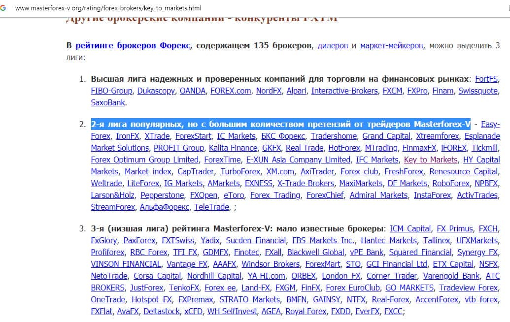 В рейтинге брокеров Форекс, который содержит 135 брокеров, дилеров и маркет-мейкеров, Key To Markets относится ко 2-й лиге популярных, но с огромным количеством претензий от трейдеров Masterforex-V. Это означает, что если Вы уже выбираете себе брокера, то Кей То Маркетс явно лучше обойти стороной.