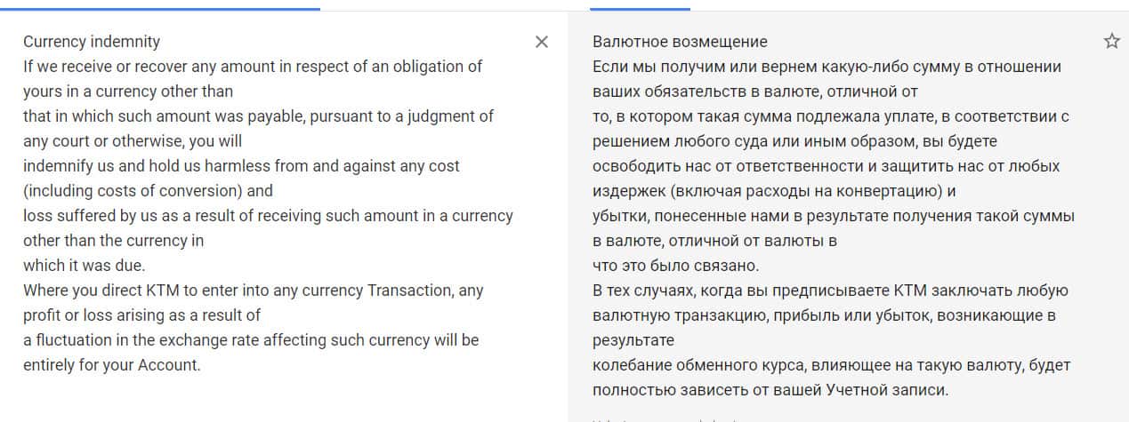 Следующий раздел договора посвящен валютному возмещению, в котором снова в случае получения валюты, отличающейся от стандартной, жулье из Key To Markets полностью снимает с себя какую-либо ответственность за Ваши операции. Явное нарушение закона и ведения двусторонней сделки одной из сторон.