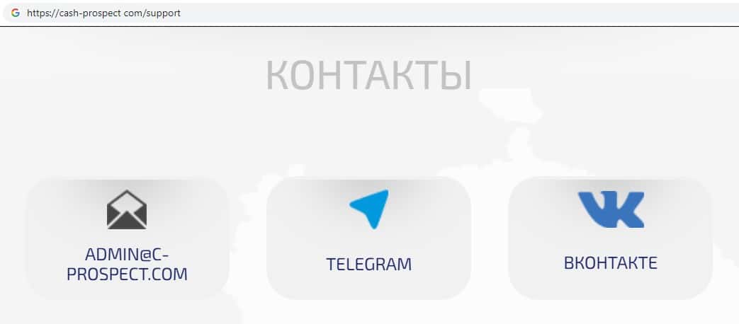 Лохотронщики Кэш Проспект в качестве контактной информации оставили две неработающие ссылки на свои страницы в социальных сетях, а также адрес электронной почты: