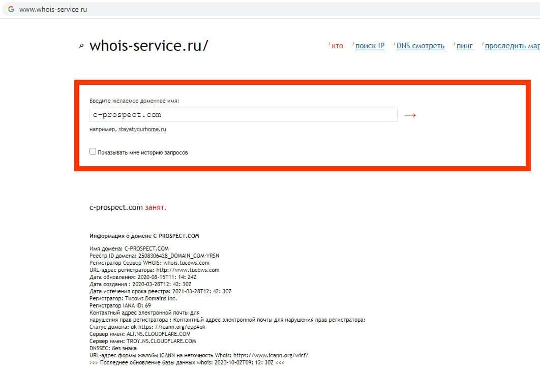 - Проверка срока действия домена компании Кэш Проспект